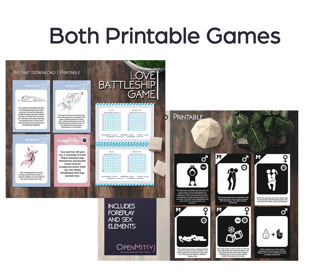 Printable couples’ games are an innovative kind of entertainment that can help couples strengthen their relationship, have fun, and enjoy each other's company more than ever. You can choose between various types of printable couples’ games, all of which can be easily printed and played with your partner. If you want to surprise your significant one with a romantic evening, candles and music might not be enough. Complement it with an exciting printable adult game that has very easy rules and creates a lot of fun for both players. Meanwhile, if you want to show care and affection to your partner, delight them with printable babysitting coupons or naughty love notes. Take a look at our printable adult games and receive them in the form of a PDF file, that you can print on your own – no need to wait for delivery.