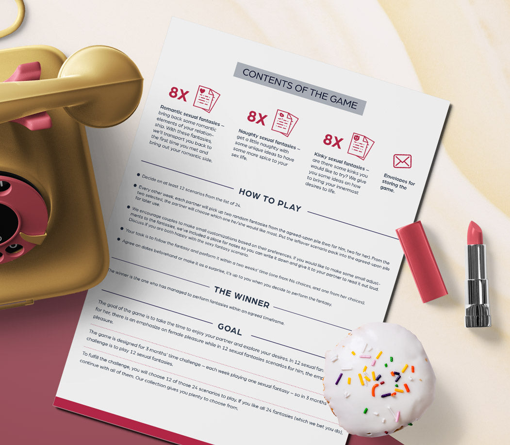 A printable game for couples, “Romantic Fantasies” is full of 24 detailed scenarios for couples split into three levels: