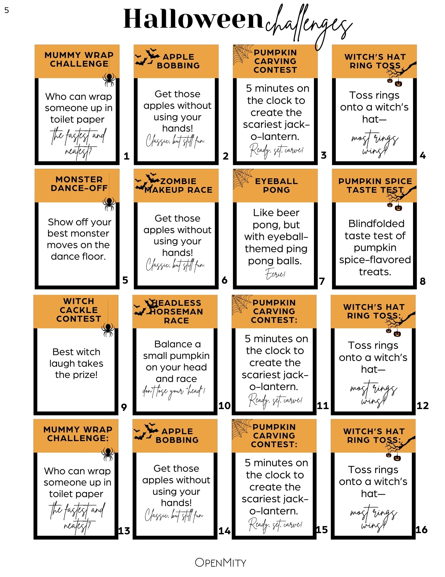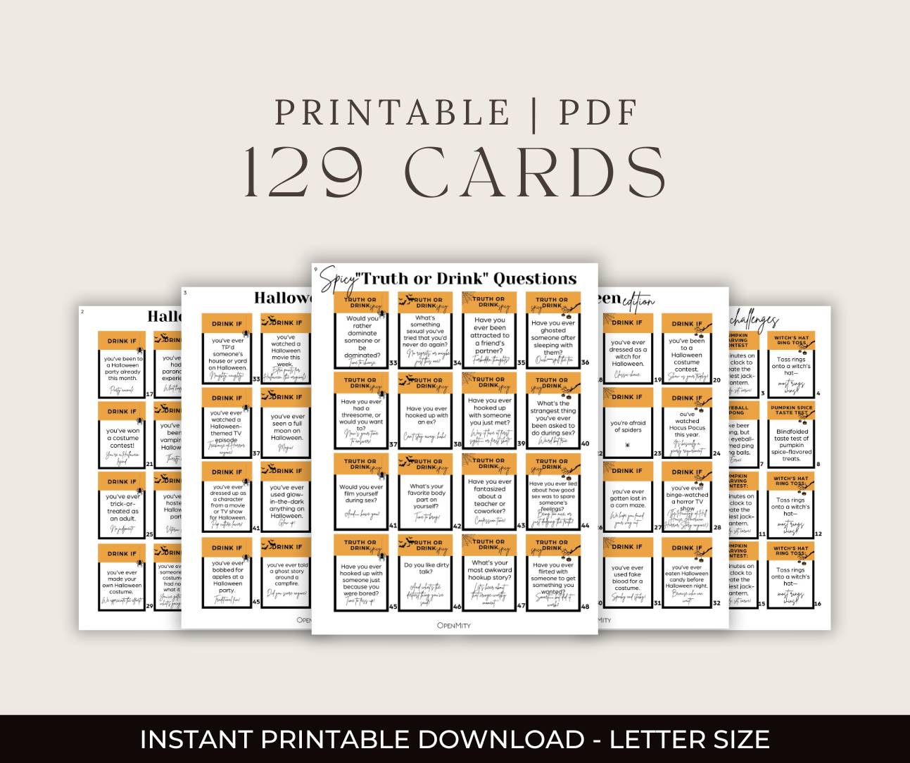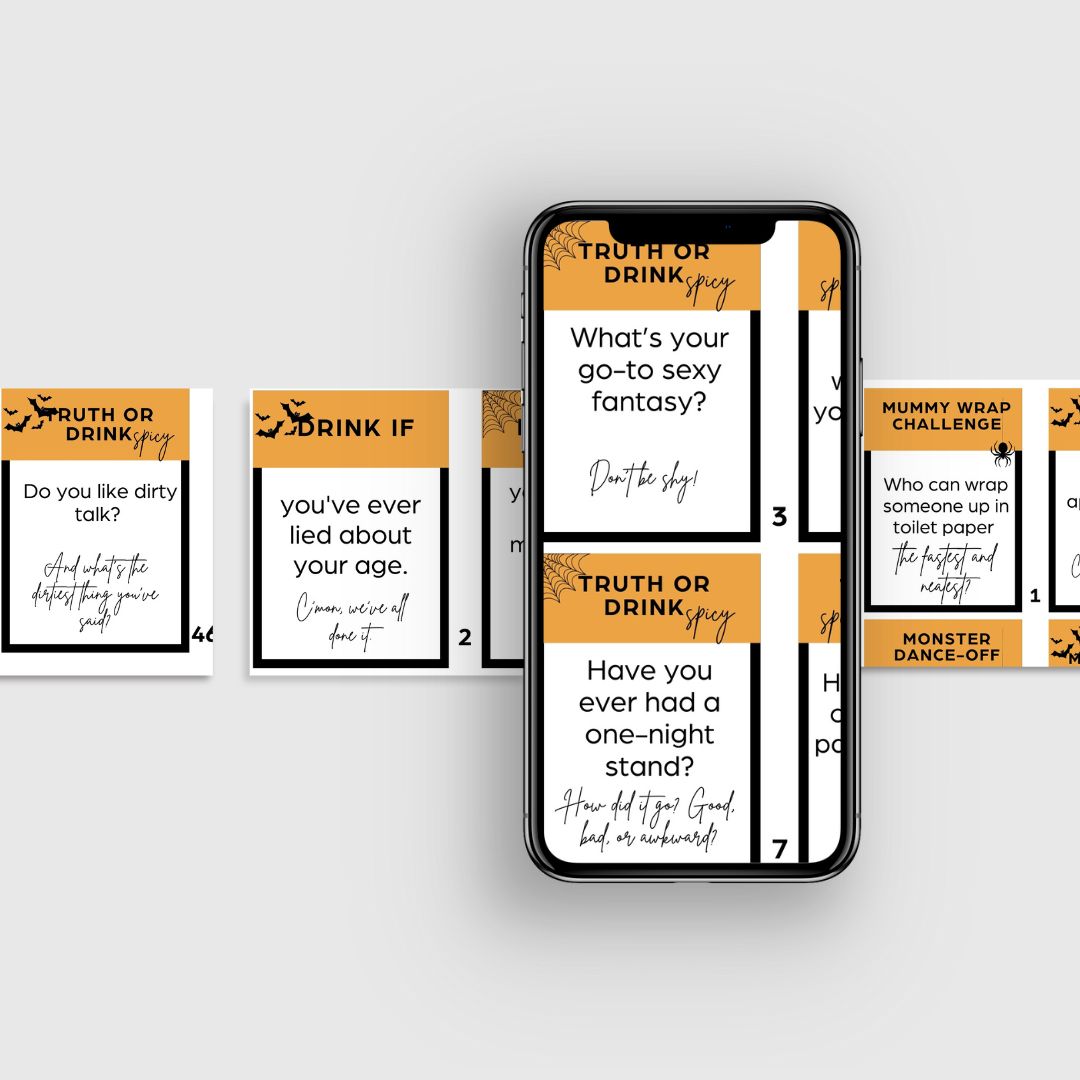 Just print and snip the cards, or download them straight to your phone! Each card has its number, so all you need to do is shout out your number to get your spooky question, daring challenge, or "drink if" card. Let the fun—and the drinks—begin!